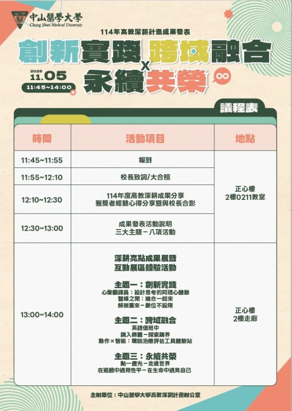 一、本校執行教育部高教深耕計畫,於114年11月5日(三)至11日(二)辦理年度成果展,將今年度的四大面向:「教學創新精進」、「善盡社會責任」、「產學連結」、「提升高教公共性」之執行成果與各校分享交流。
