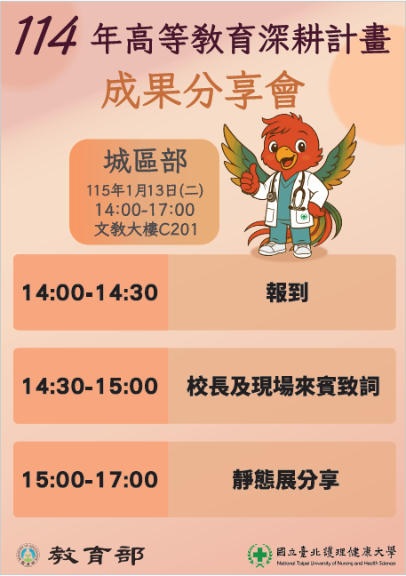 1、地點:國立臺北護理健康大學城區部文教大樓C201。