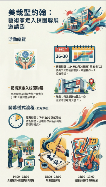 主旨:本校114年度技專校院高教深耕暨USR大學社會責任計畫謹訂於114年12月26日(星期五)至12月30日(星期二)辦理「美哉聖約翰,共創、共好成果展:藝術家走入校園聯展」,請惠予公告並鼓勵所屬教職員生踴躍參加,請查照。
