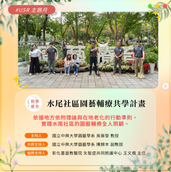 苗栗縣後龍鎮水尾社區近十年來65歲以上的長者已達到24.2%,遠高於超高齡化社區指標,我們有團隊會依循地方依附理論與在地老化的行動準則,實踐水尾社區的園藝輔療全人照顧,我們是-水尾社區園藝輔療共學計畫,以下是我們的成效
