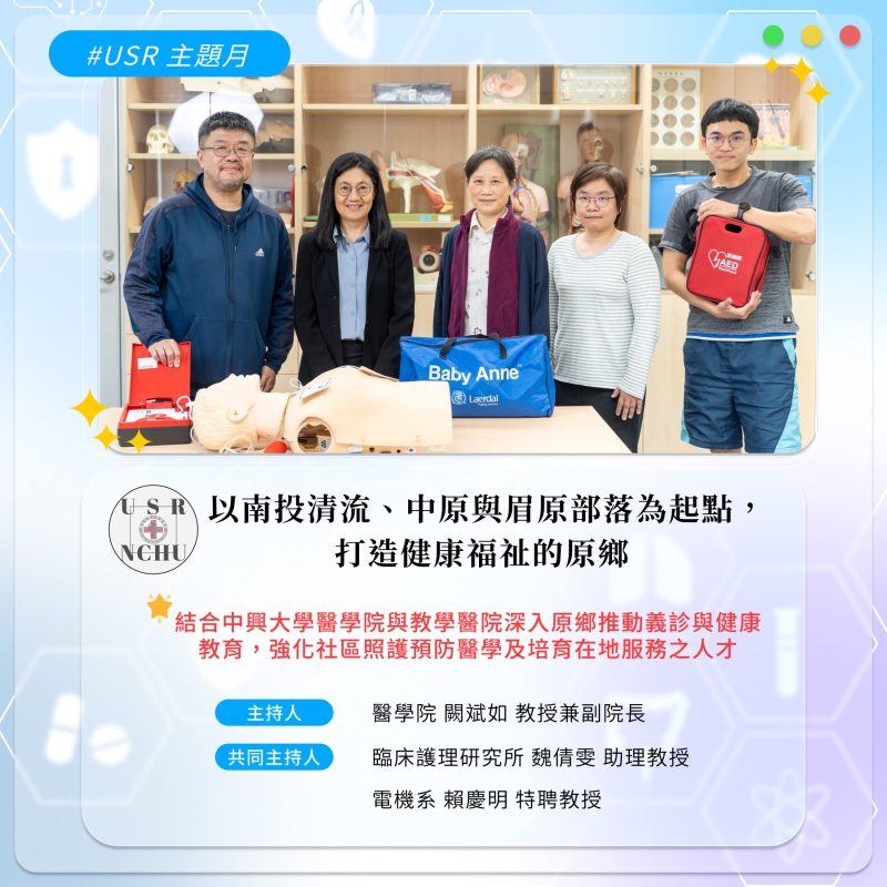 結合電機系與生機系跨域專長,成立USR計畫團隊-以南投清流、中原與眉原部落為起點,打造健康福祉的原鄉。本計畫深入原鄉部落,推展健康衛教與預防醫學,強化社區照護系統,並著重在地服務人才的培育。透過醫療、科技與教育的整合應用,為原鄉社區注入專業醫療照護資源,攜手打造健康福祉的生活環境